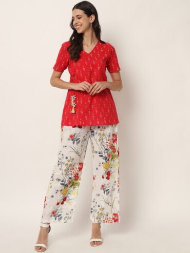 Women Red Color Ikat Print Top with Floral Palazzo Set