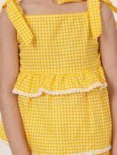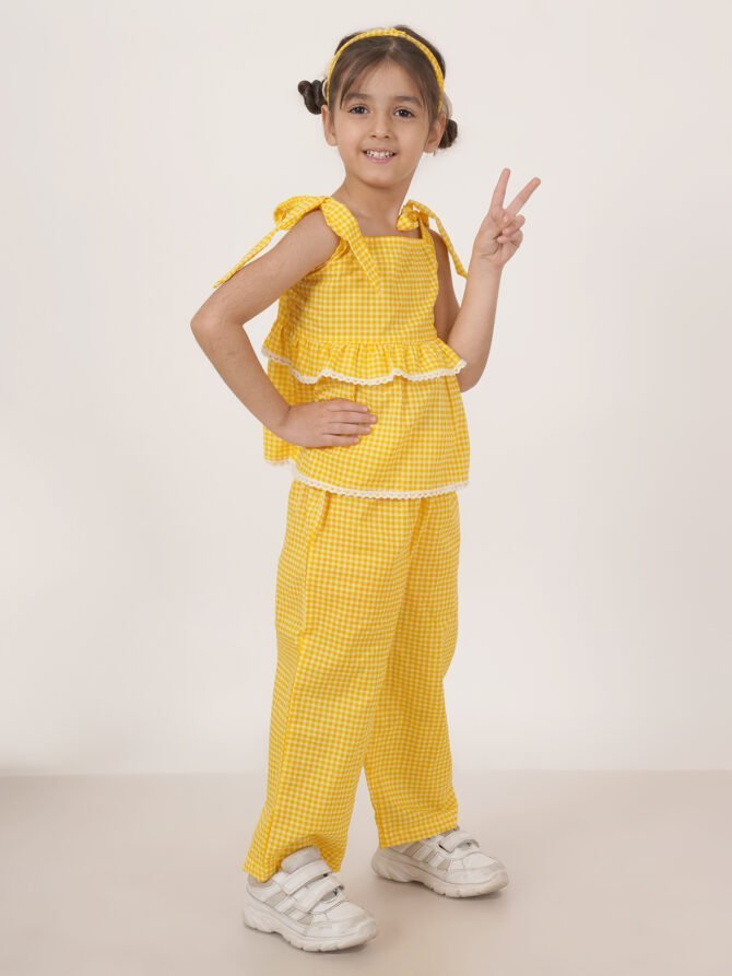 Description: The FABRIC FITOOR Checks Print Cotton Top & Palazzo Set in a vibrant yellow color is an elegant and stylish choice for young girls. This chic ensemble features a modern design with shoulder tie-ups, providing a playful and trendy touch. Accompanied by a matching hair band, this co-ord set completes the look and adds a charming detail to the outfit. Perfect for both casual outings and special occasions, it beautifully combines comfort with a fashion-forward design, making it an essential addition to your little one’s wardrobe.