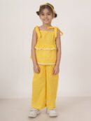 Description: The FABRIC FITOOR Checks Print Cotton Top & Palazzo Set in a vibrant yellow color is an elegant and stylish choice for young girls. This chic ensemble features a modern design with shoulder tie-ups, providing a playful and trendy touch. Accompanied by a matching hair band, this co-ord set completes the look and adds a charming detail to the outfit. Perfect for both casual outings and special occasions, it beautifully combines comfort with a fashion-forward design, making it an essential addition to your little one’s wardrobe.