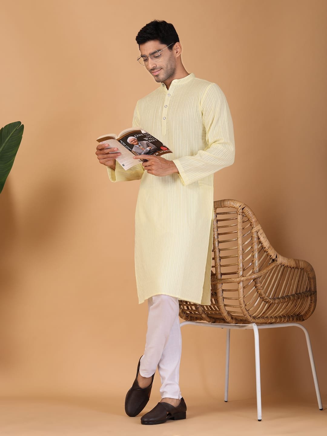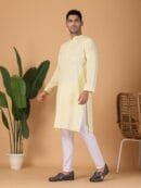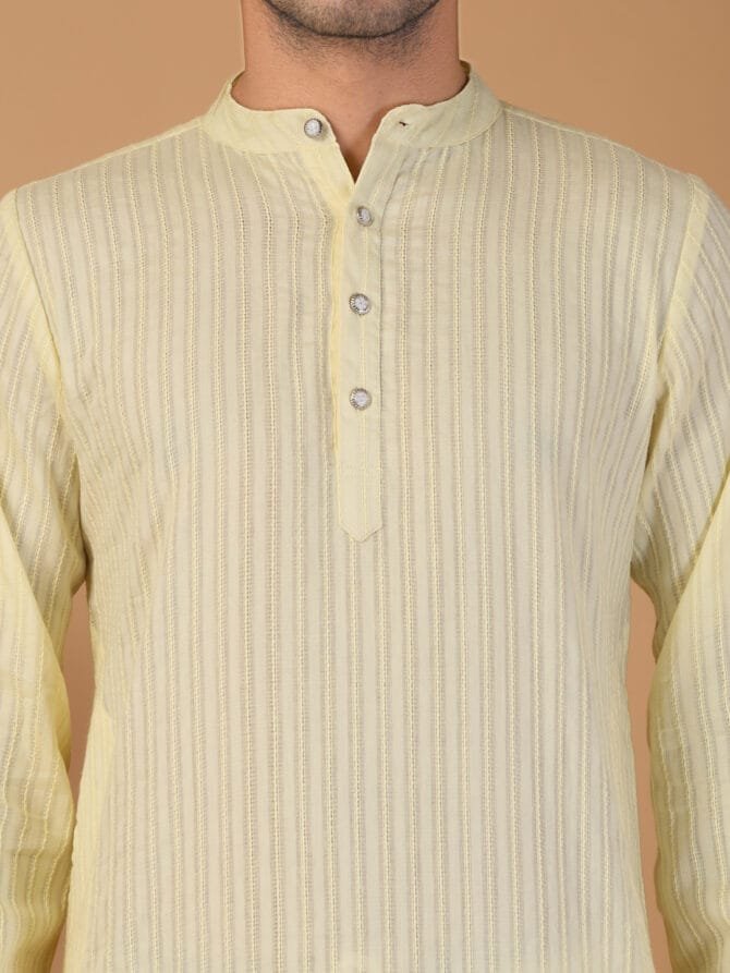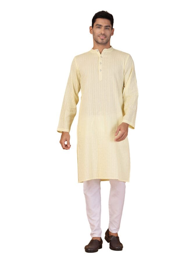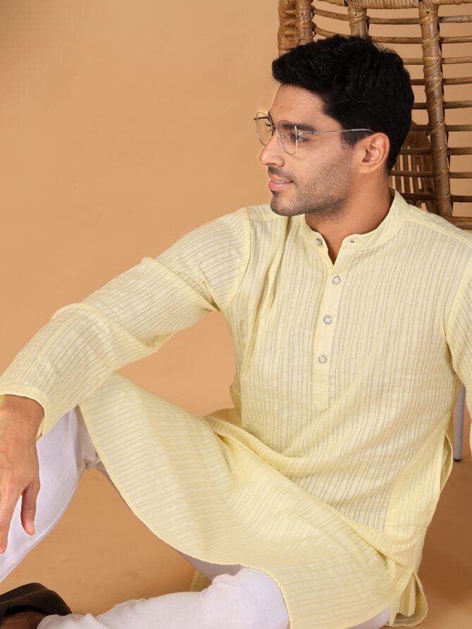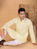 Product Description: Elevate your ethnic wardrobe with this Men’s Traditional light Yellow Cotton Kurta, a perfect blend of style and comfort. Crafted from premium-quality cotton fabric, this kurta offers a soft and breathable experience, ensuring all-day comfort for festive occasions and celebrations. The mandarin collar and minimalist design add a sophisticated touch, making it ideal for casual gatherings or formal events. The vibrant white color exudes confidence and festivity, making it perfect for occasions like weddings, Diwali, Eid, or family functions.