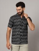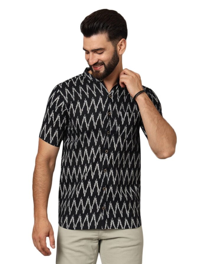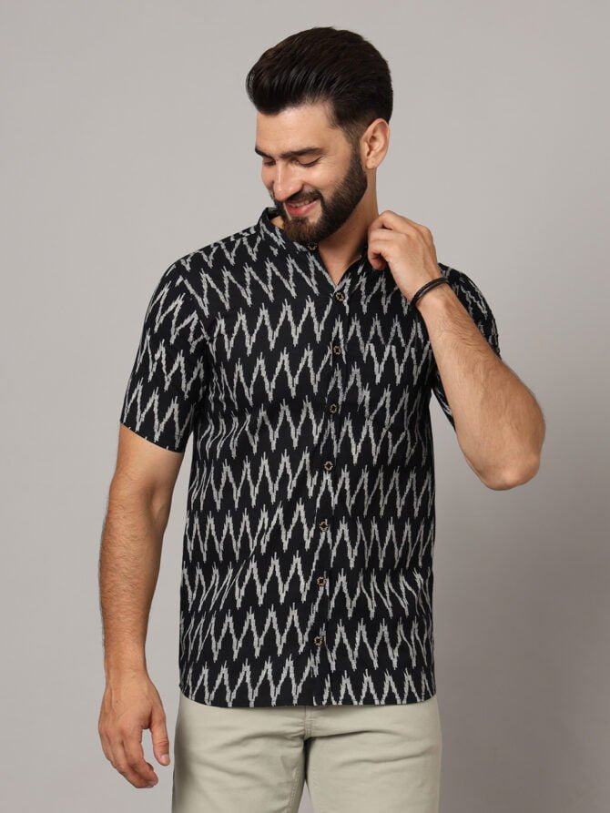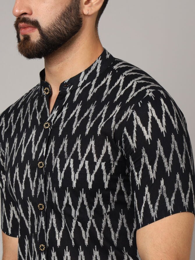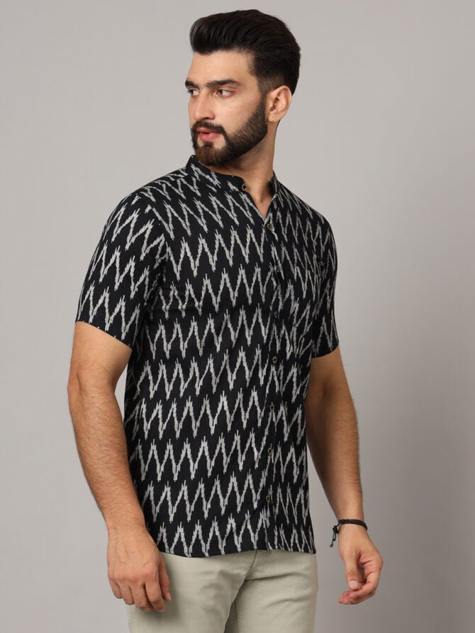 Product Title: FABRIC FITOOR Men’s Pure Cotton Chevron Print Mandarin Collar Black Color Shirt