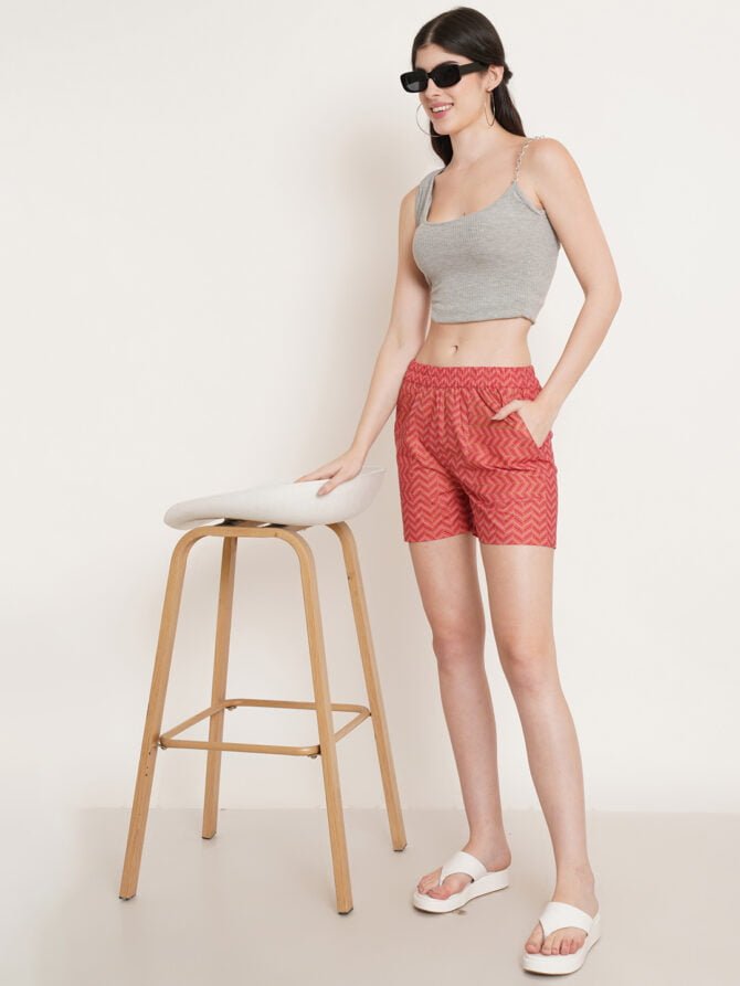 Womens Geometric Print Cotton Red Color Patch Pockets Shorts
