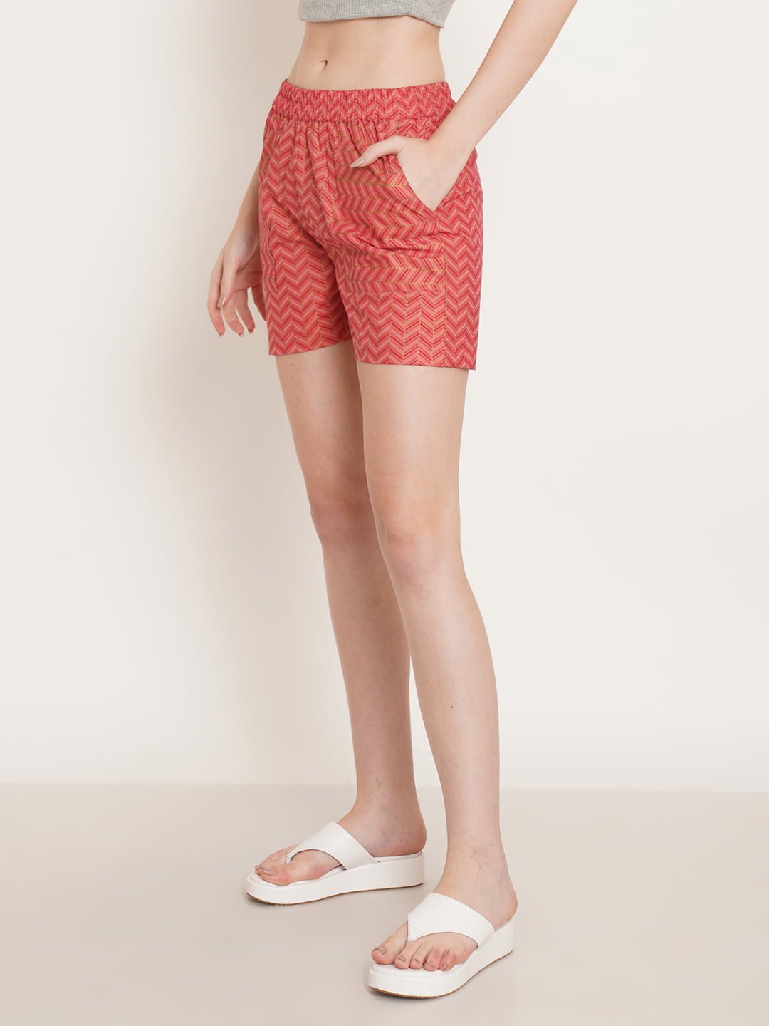 Womens Geometric Print Cotton Red Color Patch Pockets Shorts
