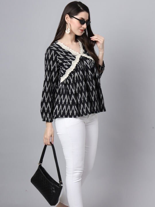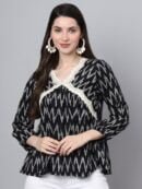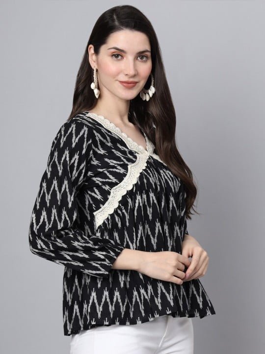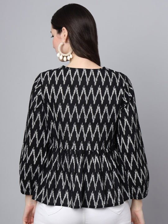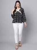 Elevate your casual wardrobe with the Devaarti Printed Casual Alia Cut Top. This chic black shirt features a striking animal print that is sure to make a statement wherever you go.
