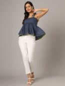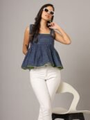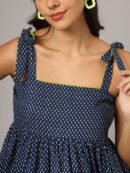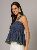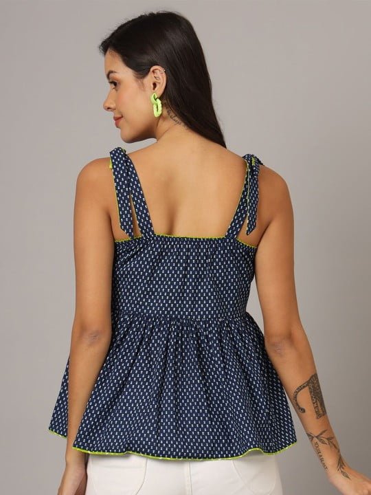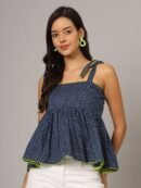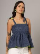 Elevate your casual style with this charming navy blue polka dot peplum top. Featuring stylish shoulder straps and a sleeveless design, this top adds a fun and playful touch to any outfit. The peplum silhouette offers a feminine flair, and the regular length ensures it pairs effortlessly with jeans, skirts, or shorts. Crafted from breathable woven cotton, this top guarantees comfort and all-day wearability, making it perfect for warm-weather outings.