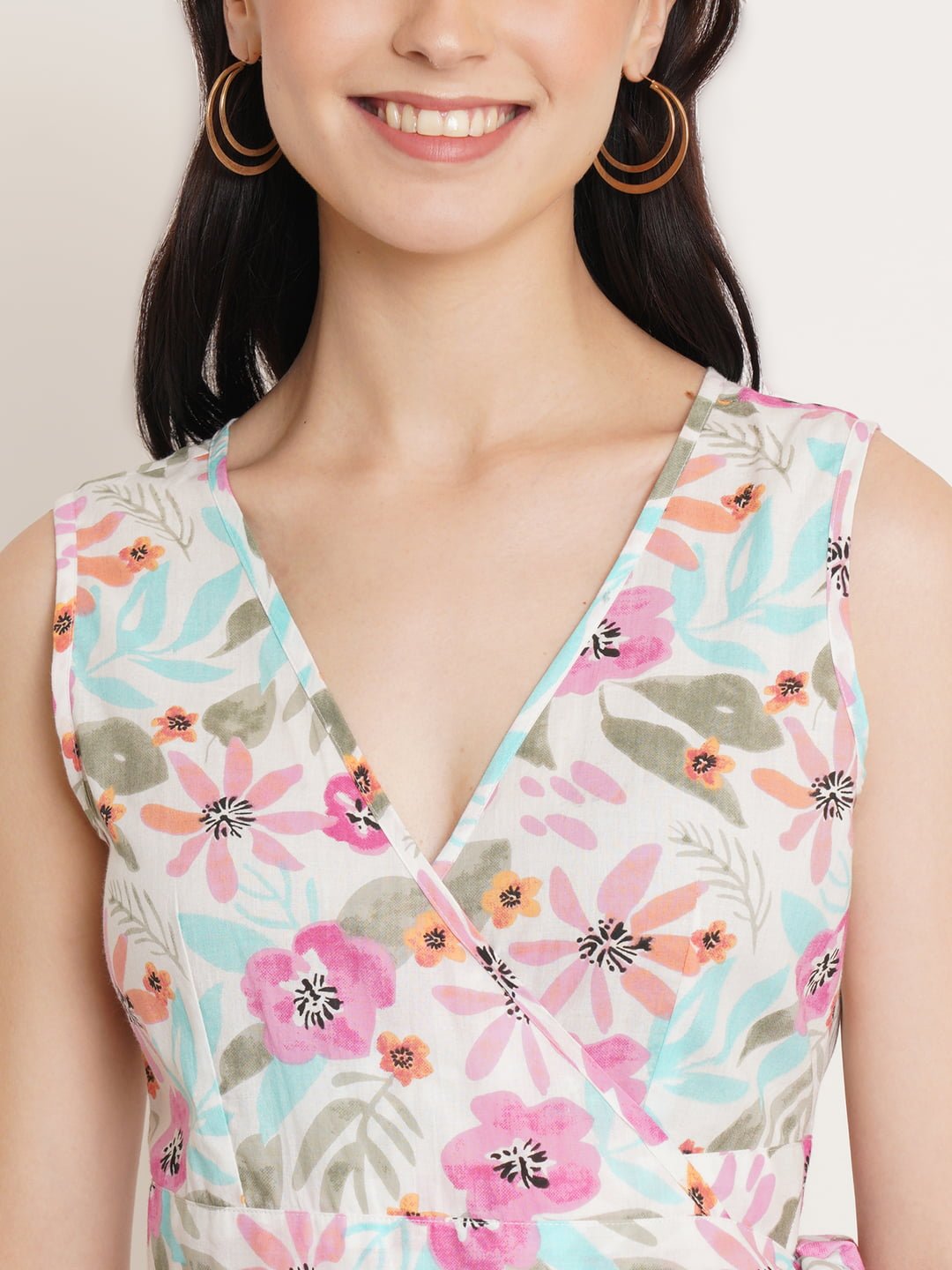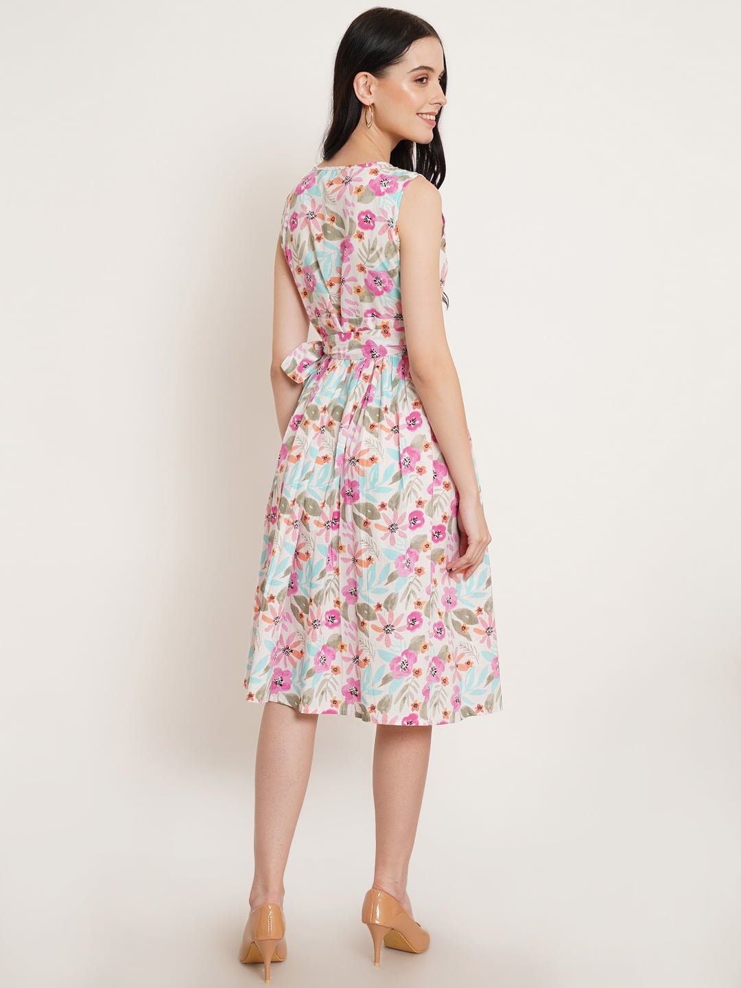 Chic Versatility: Step into effortless elegance with this Women’s White Floral Print V-Neck Wrap Dress from Fabric Fitoor. Perfect for casual, festive, and party wear, this knee-length dress combines style and comfort seamlessly.