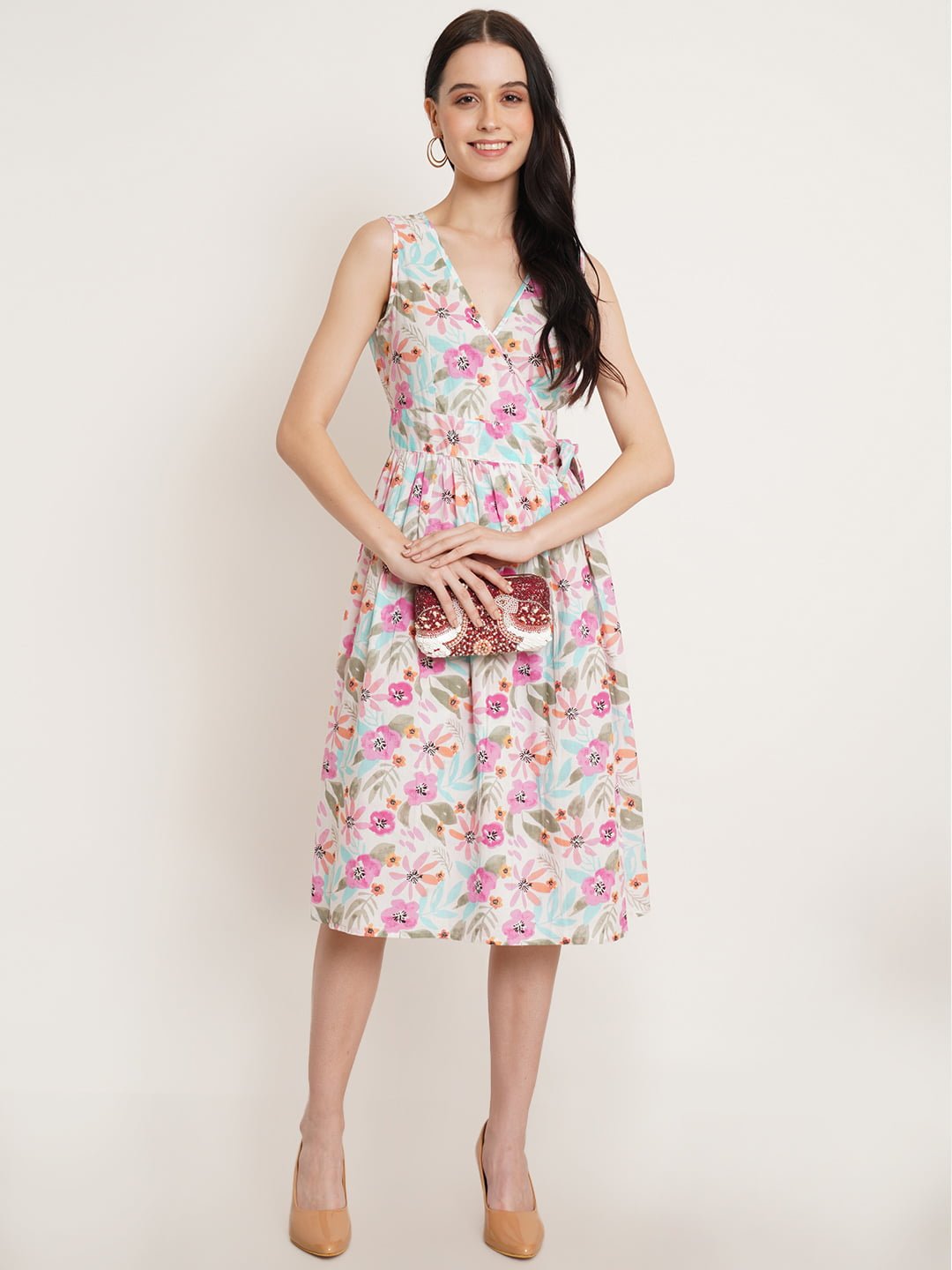 Elegant Design: Featuring a stylish V-neck and sleeveless design, this dress is adorned with a vibrant floral print. The wrap style with a waist belt allows for a flattering silhouette, adding a touch of sophistication to your wardrobe.