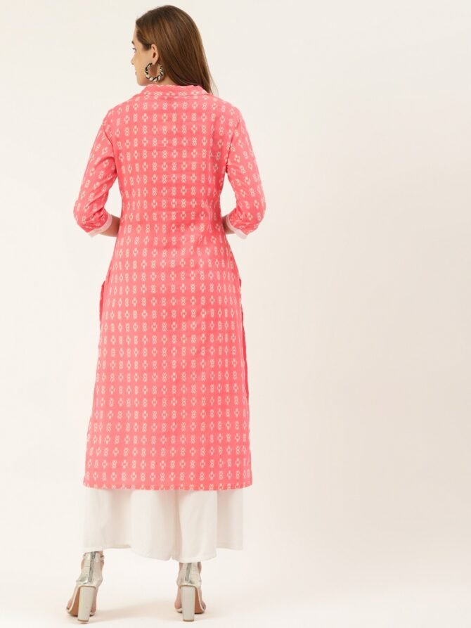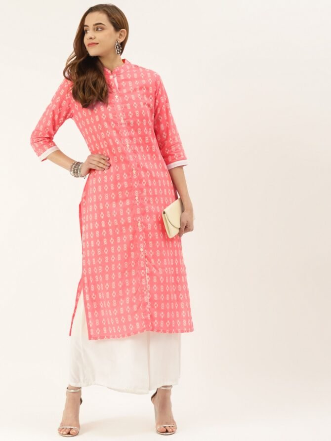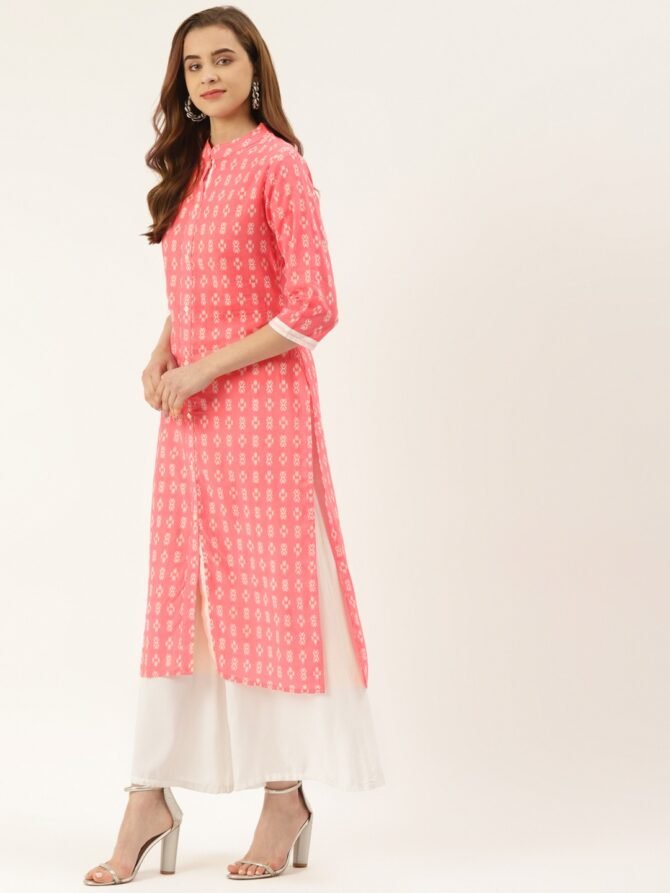 Description: Experience the elegance of traditional Indian wear with this cotton Ikat print kurta and palazzo set from Fabric Fitoor. Made from pure Jaipuri mul fabric, this straight-fit kurta is designed with a mandarin collar and 3/4 sleeves, perfect for everyday wear or special occasions. The kurta features shell buttons on the placket and a stylish white stripe on the sleeves for added detail. The calf-length (46 inches) kurta is paired with a matching palazzo, making it a versatile choice for casual, festive, and party events.