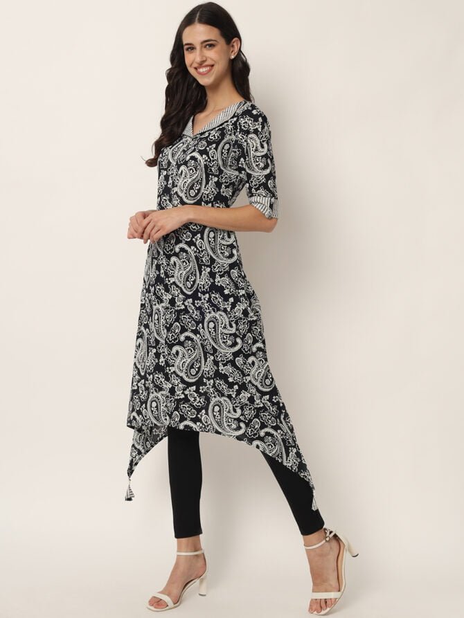 The kurta features a classic paisley print, adding a touch of elegance to your ensemble. With a shirt collar and short roll-up sleeves, it offers a modern silhouette while ensuring breathability and comfort. The A-line shape is complemented by an asymmetric hem, giving it a trendy edge that stands out in any setting.