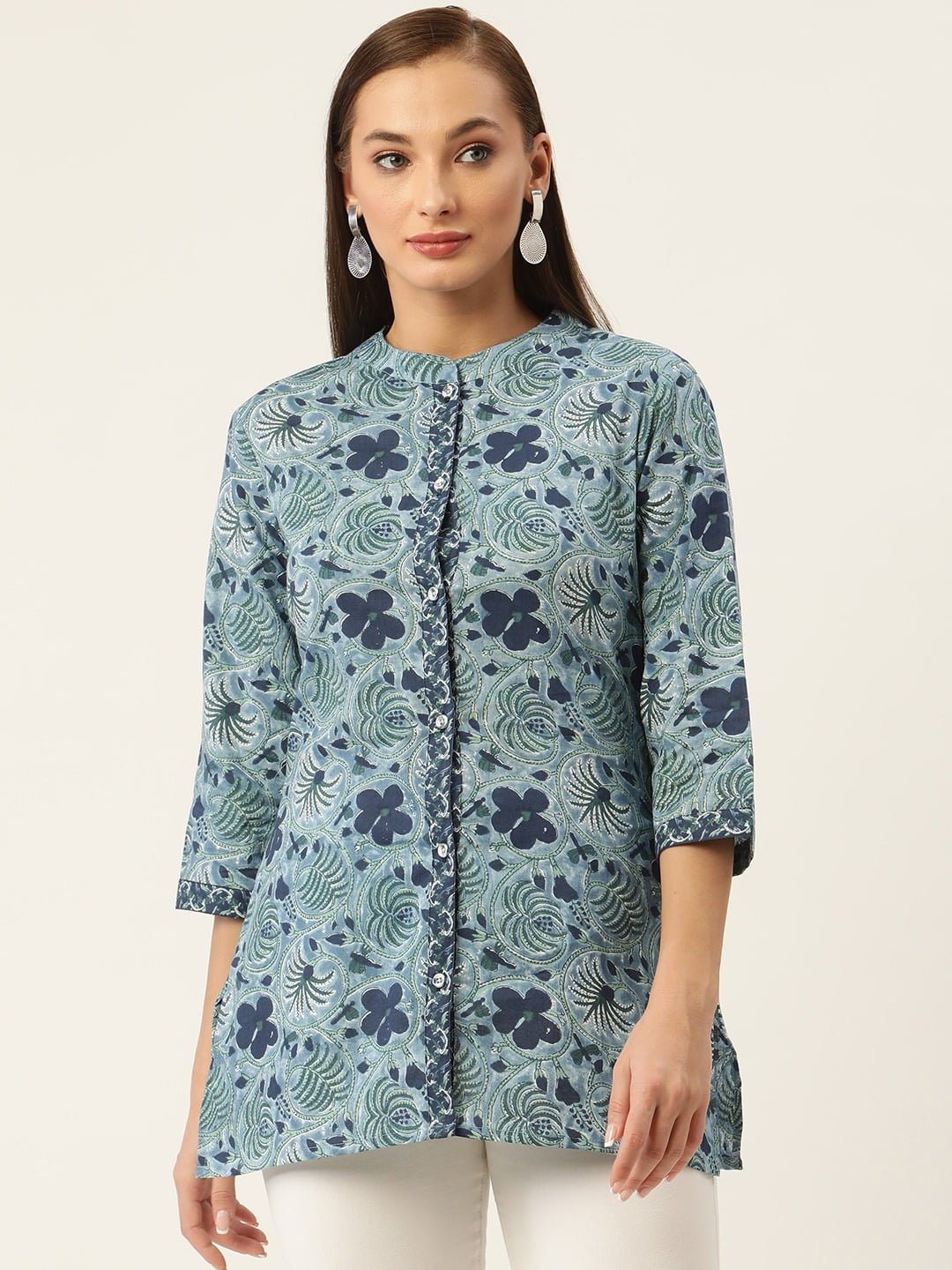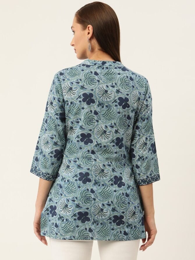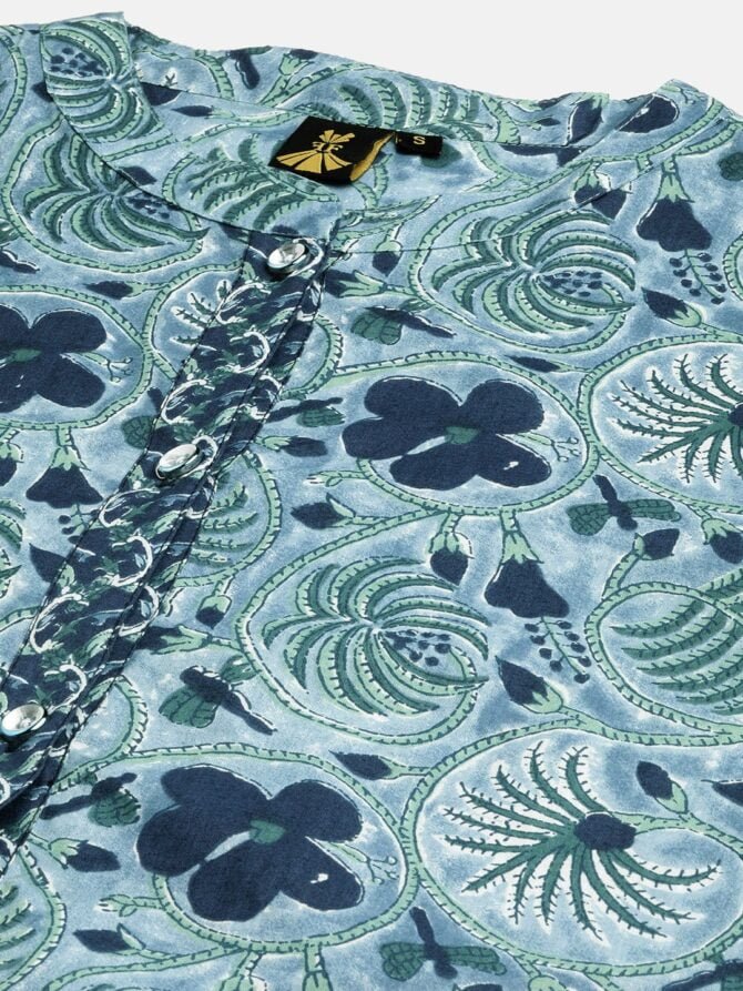 - Colour: A rich navy blue hue adorned with vibrant floral block prints, perfect for adding a pop of color to your wardrobe.