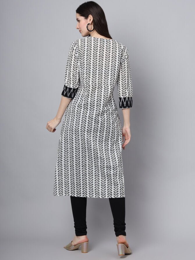 Elevate your ethnic wardrobe with the Fabric Fitoor Women’s Jaipuri Cotton A-Line White & Black Floral Printed Kurta. This beautiful and elegant piece is crafted from premium quality cotton, ensuring both comfort and style. Featuring a flattering A-line silhouette, this kurta drapes gracefully on the body, making it a versatile choice for various occasions.