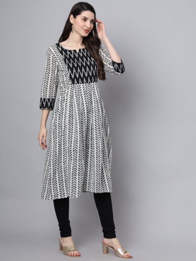 The intricate floral print in striking black and white adds a touch of femininity and charm to the overall look, making it perfect for casual outings or festive gatherings. The round neck and three-quarter regular sleeves provide a classic touch, while the calf-length flared hem enhances its graceful appeal.
