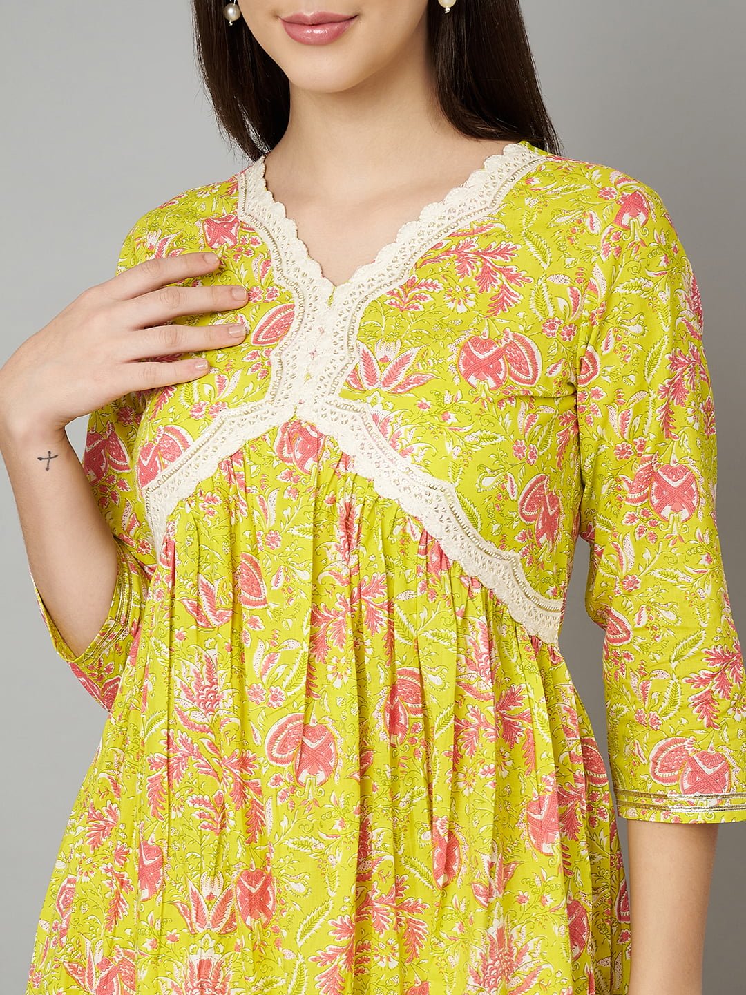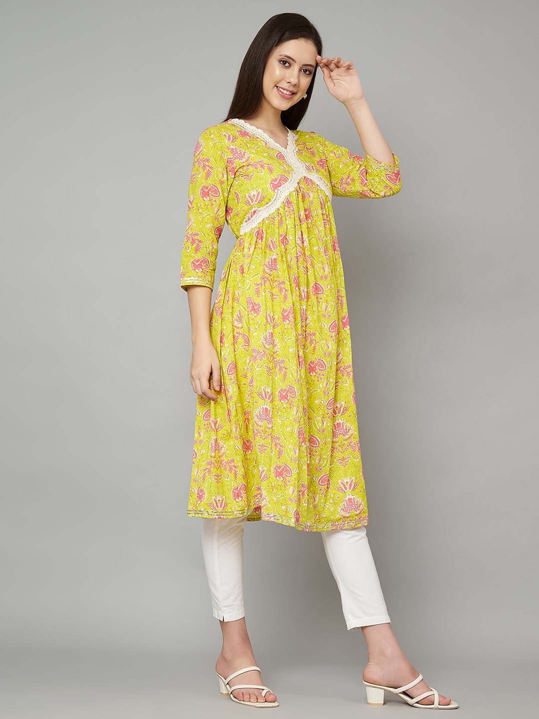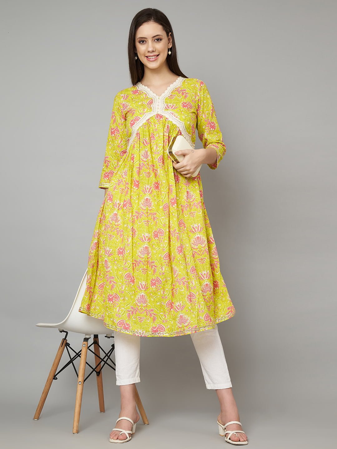 Step into elegance with the Fabric Fitoor Women’s Cotton A-Line Floral Kurta, a perfect blend of traditional style and modern comfort. This kurta is crafted from premium cotton with a stunning floral print in vibrant yellow and pink hues, making it a versatile piece for your everyday wardrobe. The V-neck design and three-quarter regular sleeves enhance the simple yet chic look, while the A-line shape and empire style create a flattering silhouette. The lace detail adds a feminine touch, elevating the overall look.
