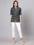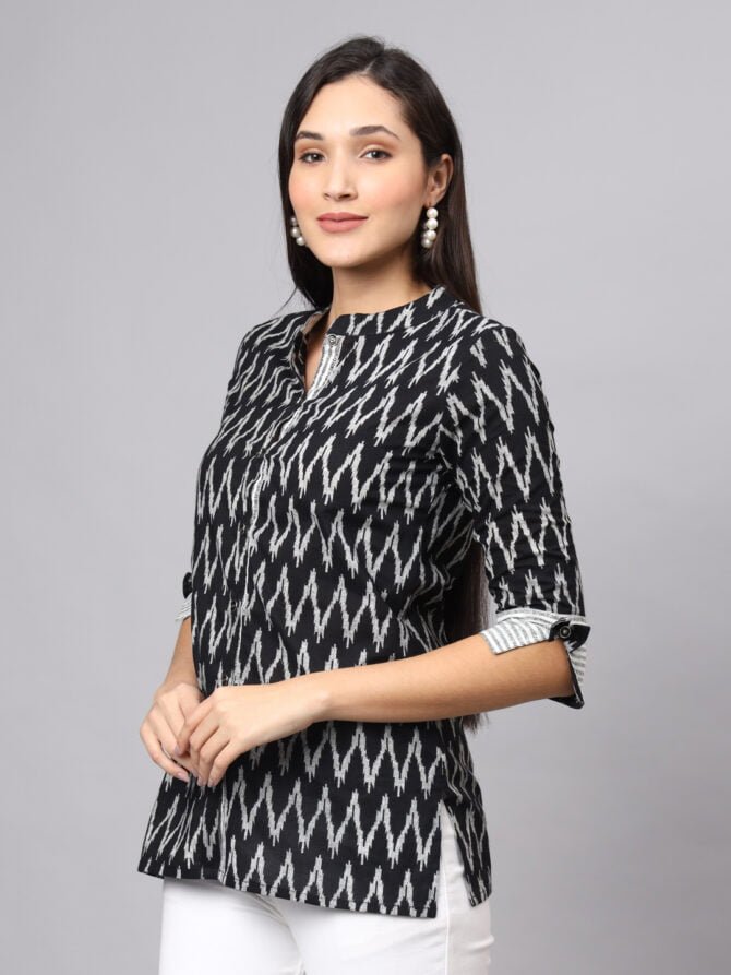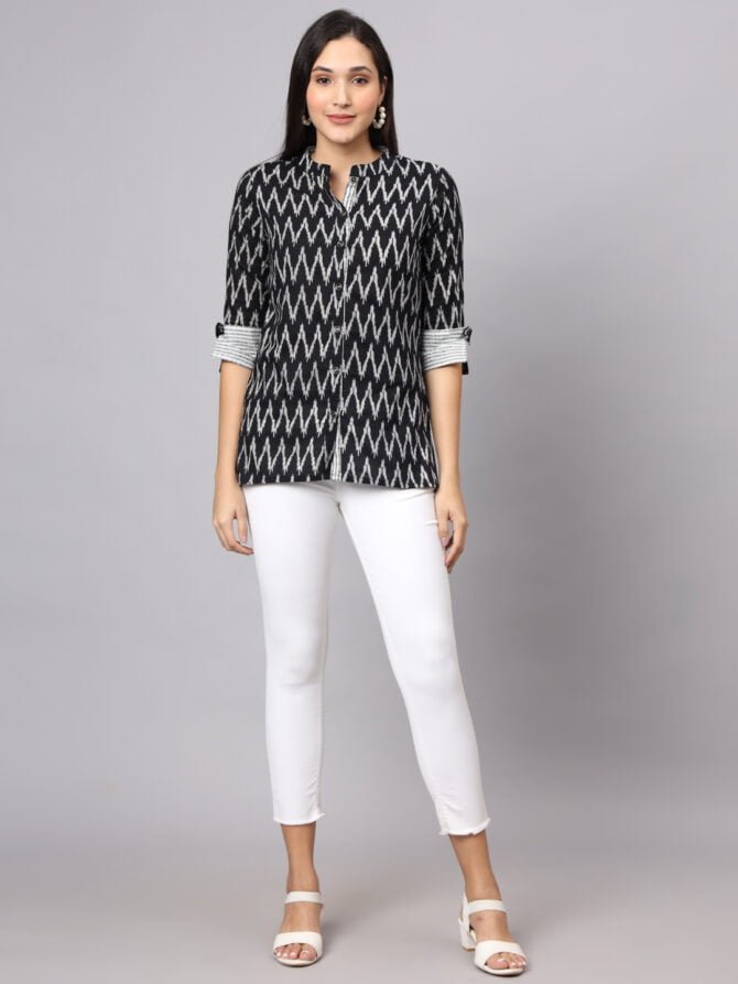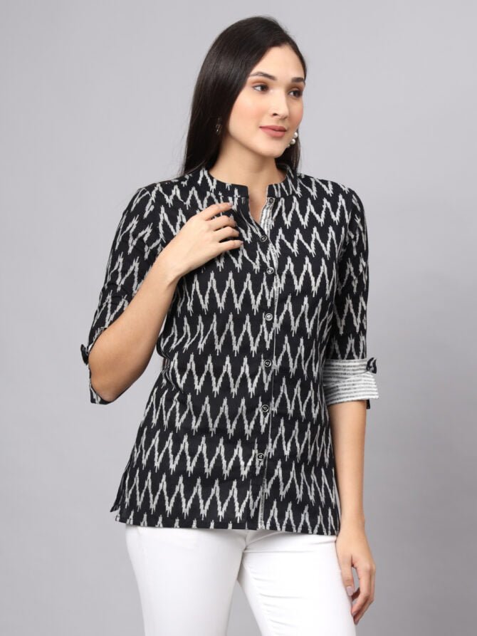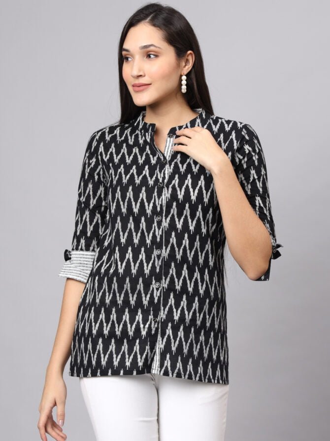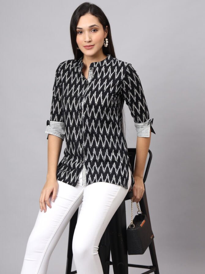 Elevate your wardrobe with the FABRIC FITOOR Women’s Cotton Black Color Zigzag Print Shirt, a sophisticated choice that effortlessly blends style and comfort.