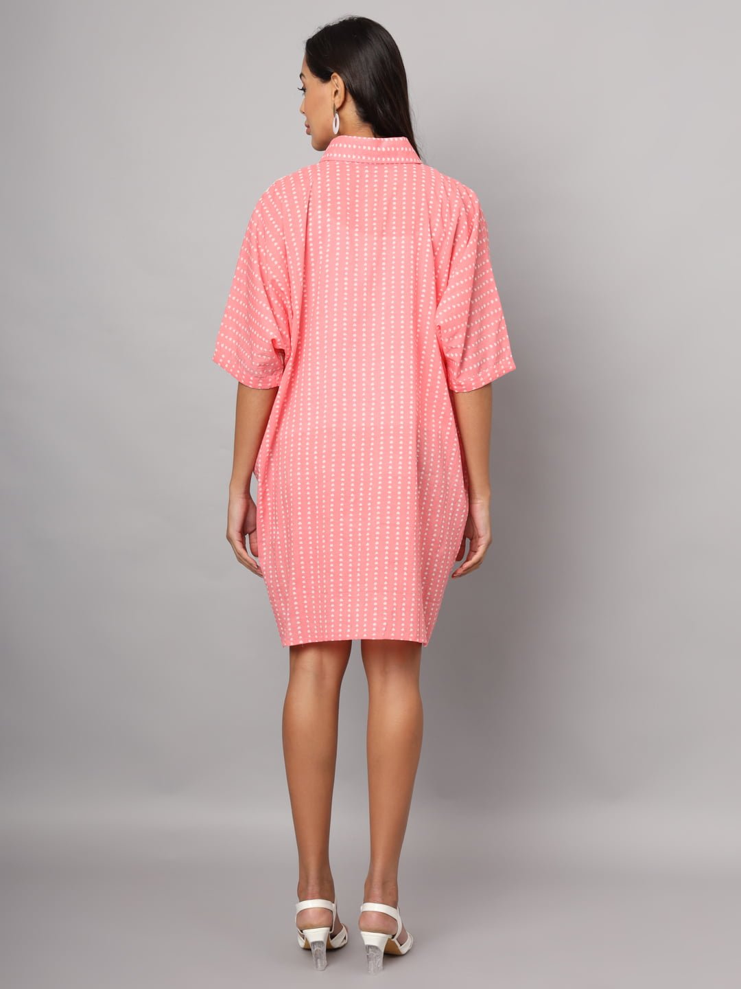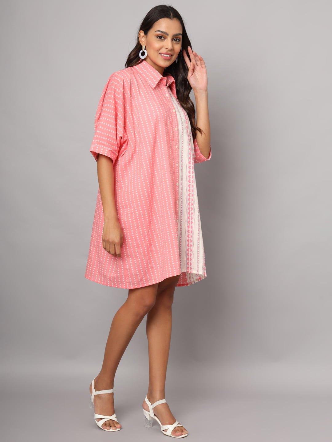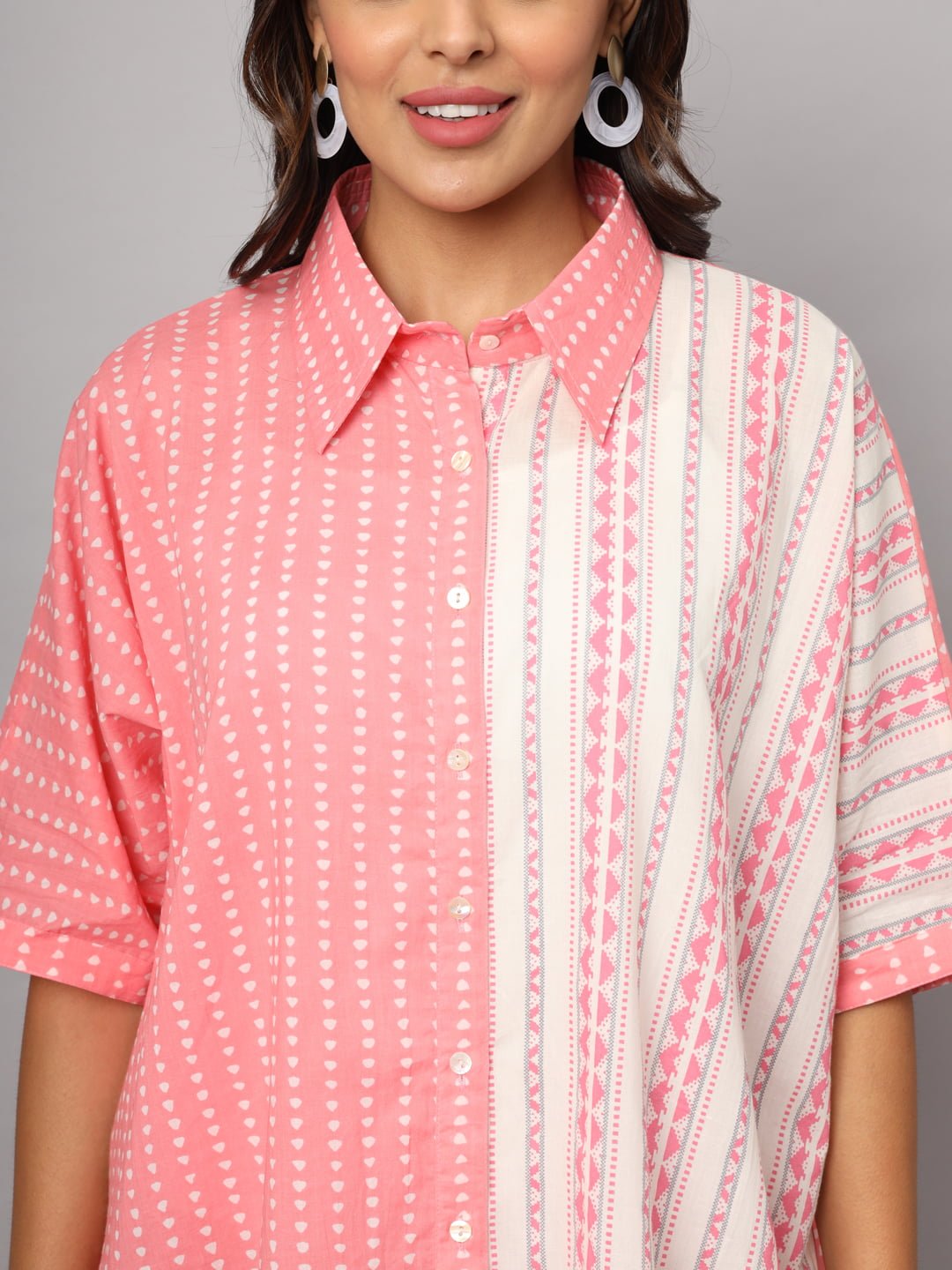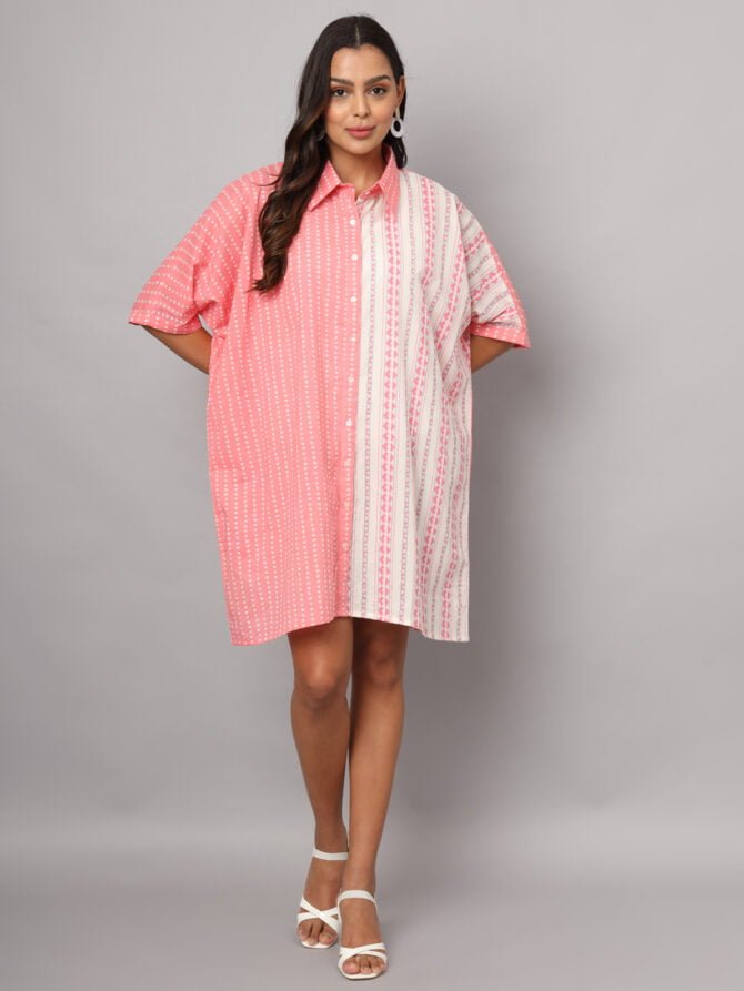 Elevate your fashion game with the Women’s Cotton Pink & White Color Geometric Prints Oversized Knee Length Shirt—a must-have for every fashion-savvy woman looking to make a statement with comfort and style!