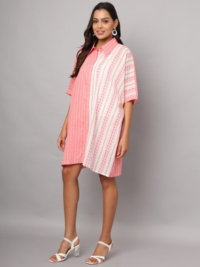Introducing the Fabric Fitoor Women’s Cotton Pink & White Color Geometric Prints Oversized Knee Length Shirt, a chic and sophisticated addition to your wardrobe that embodies elegance and style.
