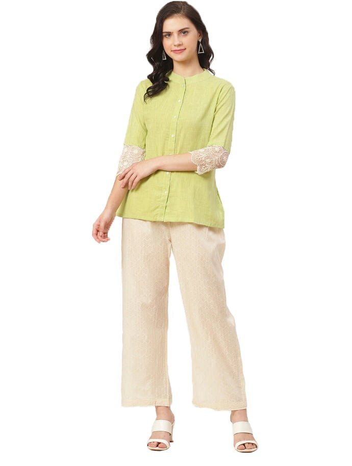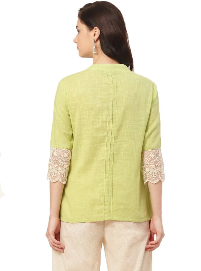 Upgrade your wardrobe with the Women’s Pure Cotton Solid Lime Green Color Mandarin Collar 3/4th Sleeve Casual Shirt, a perfect blend of style and comfort that will keep you looking effortlessly chic!