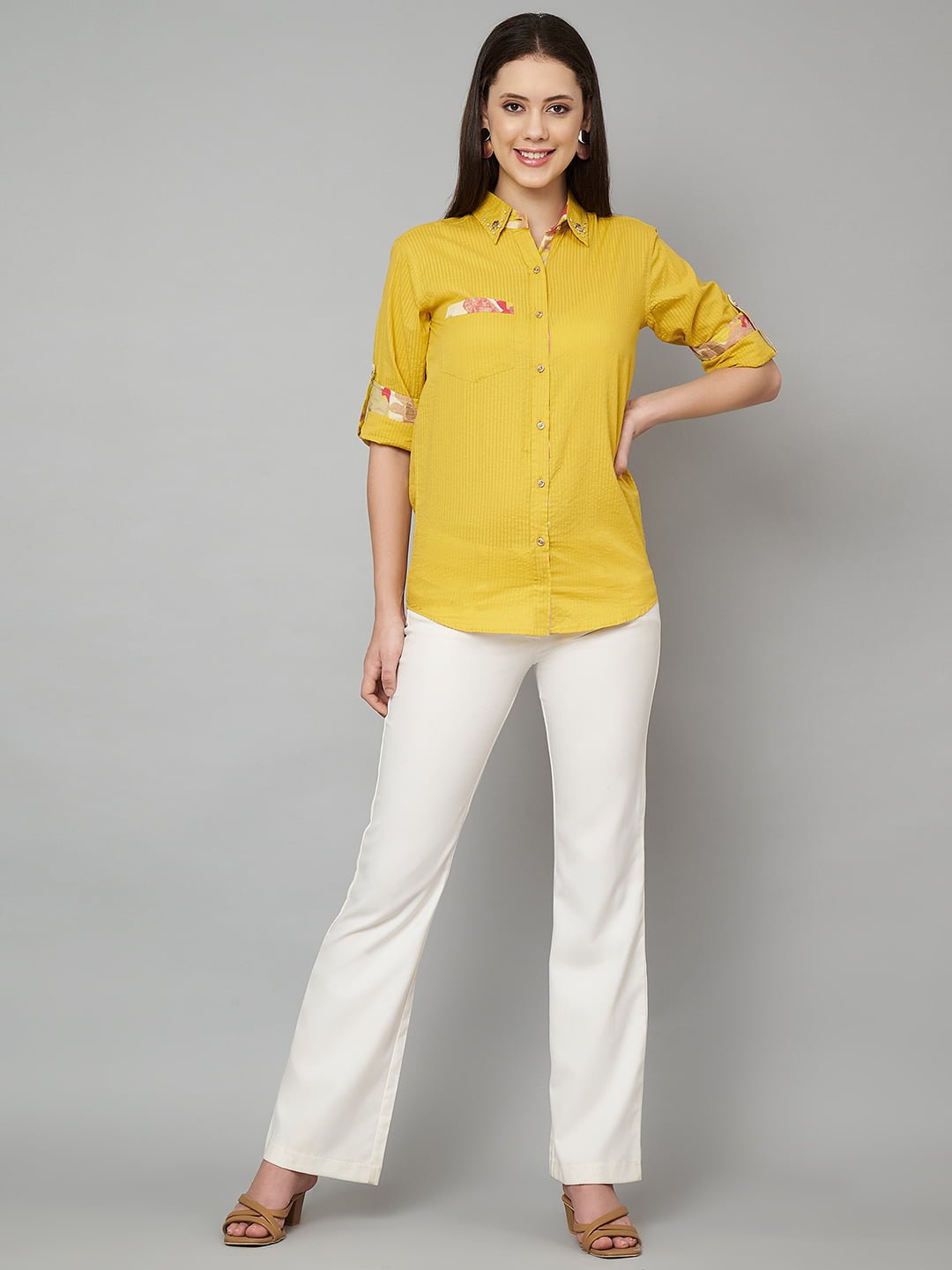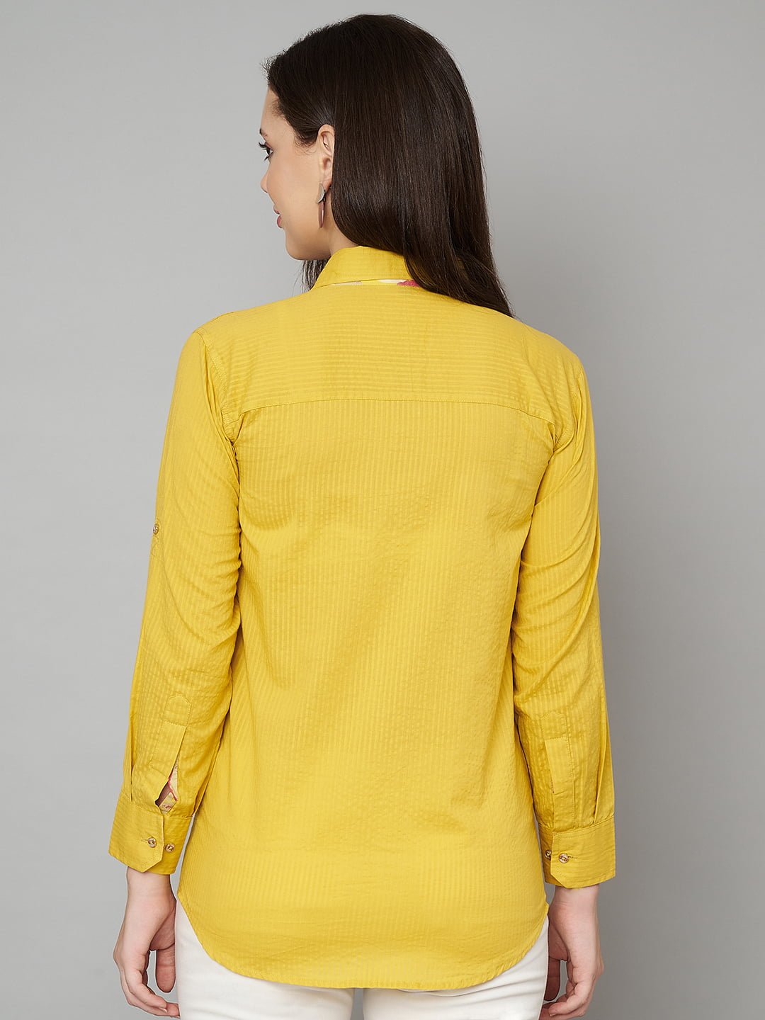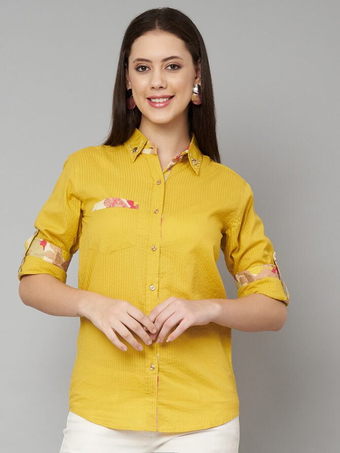 Elevate your everyday style with the Womens Jaipuri Pure Cotton Mustard Yellow Spread Collar Casual Shirt. This stunning top is crafted from soft and breathable pure cotton, ensuring all-day comfort and a flattering fit. The vibrant mustard yellow color adds a cheerful touch to your wardrobe, while the unique spread collar and straight fit provide a modern twist on traditional design.