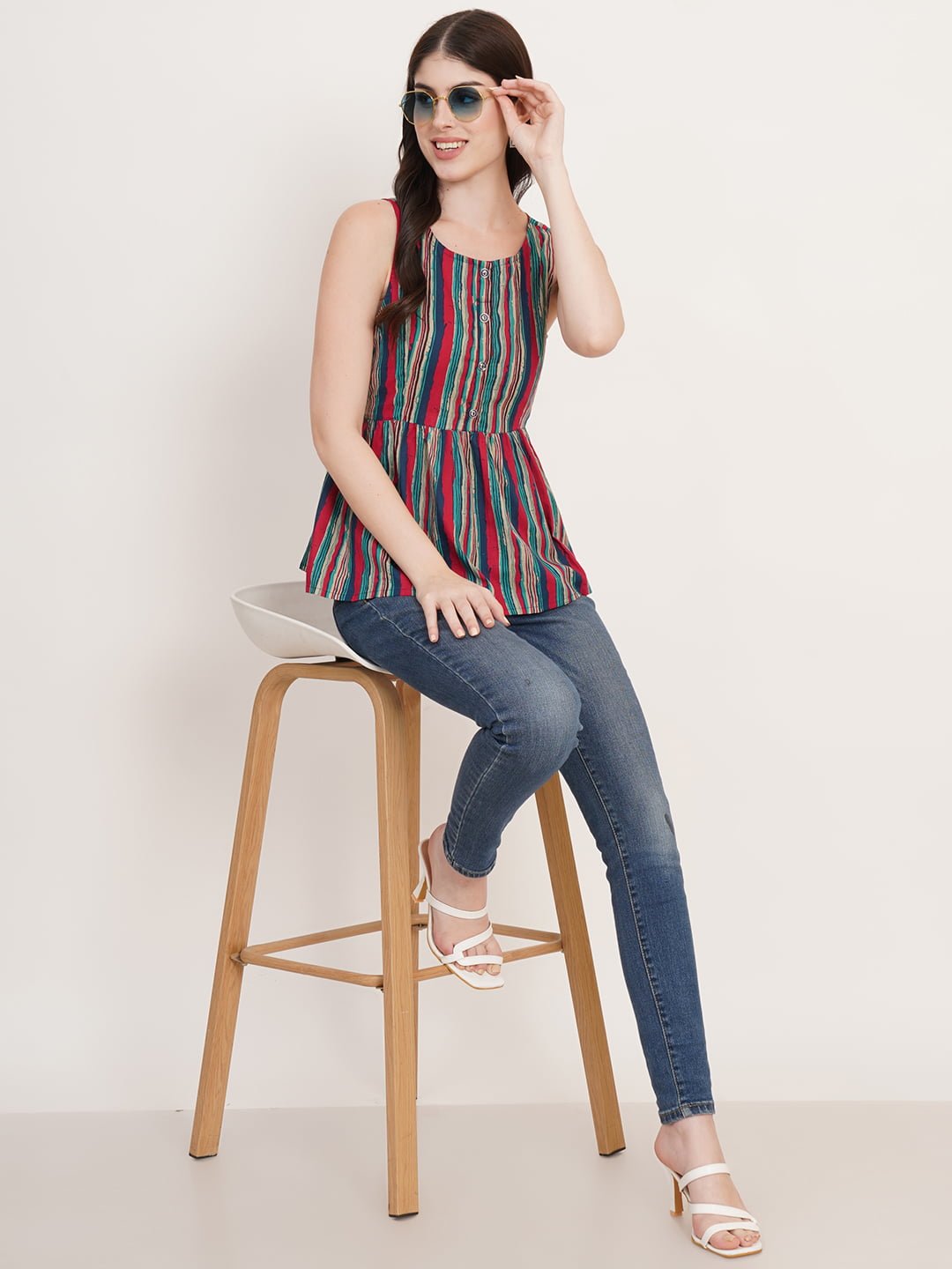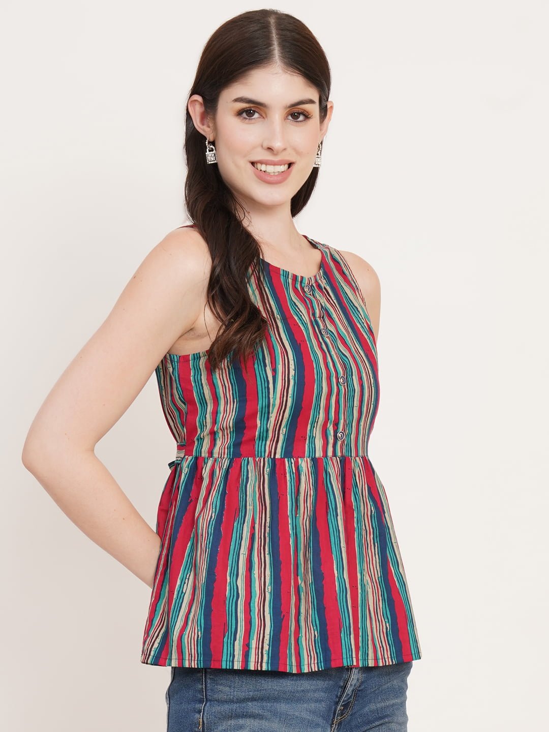 - Color & Print: Showcasing a striking combination of red and blue vertical stripes, this top adds a refreshing touch to your outfit.