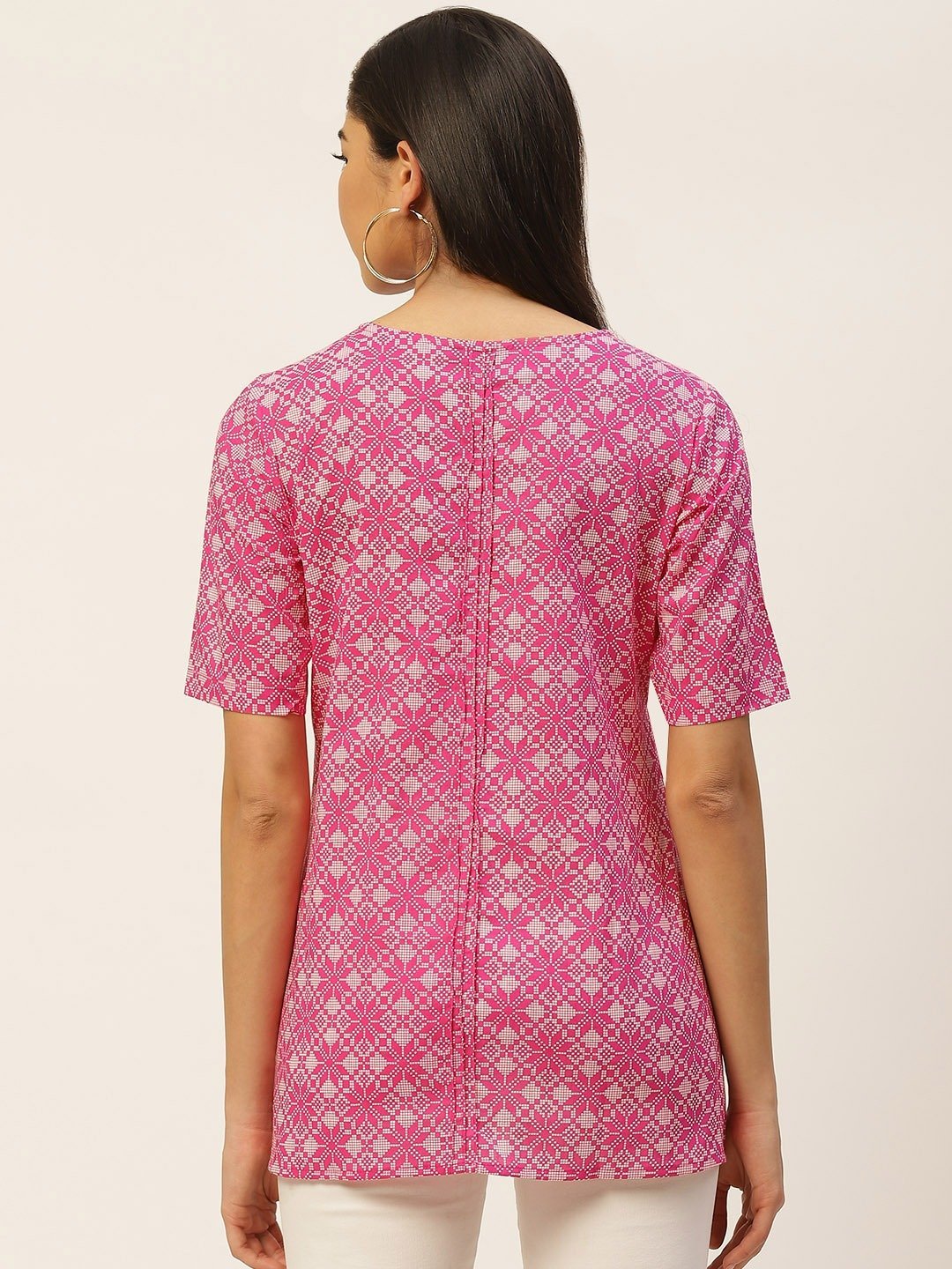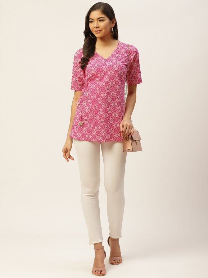 - Color & Print: A vibrant pink hue adorned with geometric prints, bringing a fresh and trendy vibe to your outfit.