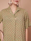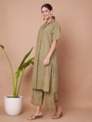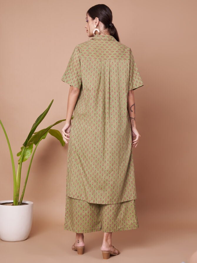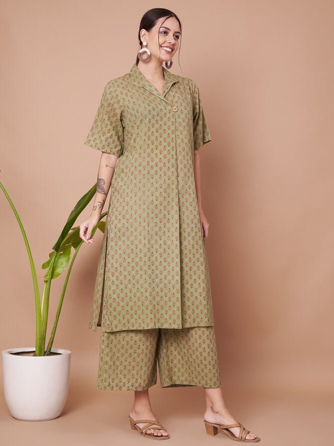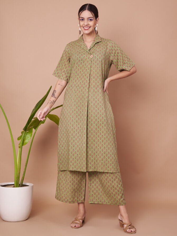 Embrace Effortless Elegance: Enhance your wardrobe with this stylish and comfortable olive green kurta and palazzo set from Fabric Fitoor. Perfectly designed for both casual and festive occasions, this set offers a blend of comfort and elegance.