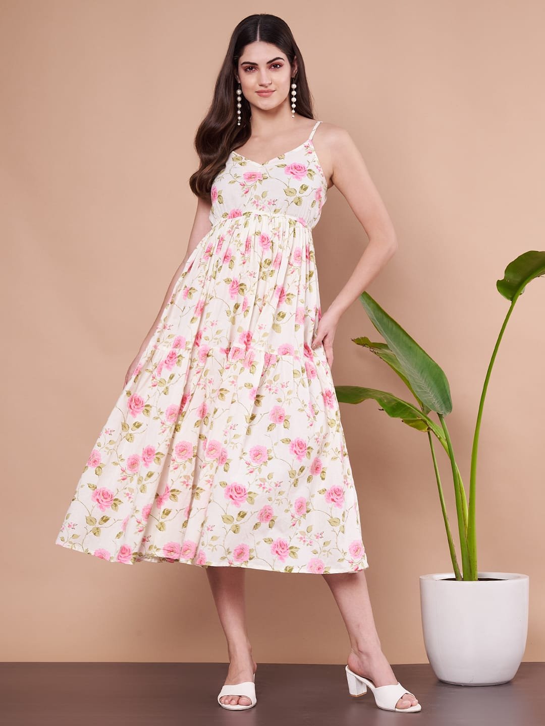 Chic and Elegant Design: Embrace effortless style with the Fabric Fitoor Women’s Cotton Floral Print Dress. This midi dress features a delightful combination of off-white and pink floral patterns, adding a touch of femininity to your wardrobe.
